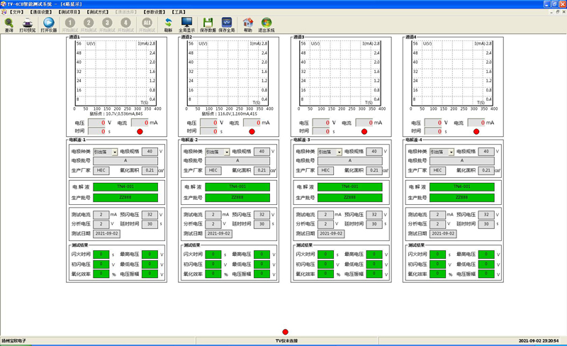 TV-2CH型智能TV测试仪是采用原日本铝箔化成电源改进的电源电路及单片机外围电路,全电脑软件智能控制模式,实现对化成铝阳极箔TV特性及电解液闪火电压等综合电性能的自动检测。不需要人工进行干预,软件具有操作简单、直观、快捷的特点,领先于国内同类检测仪器新产品。